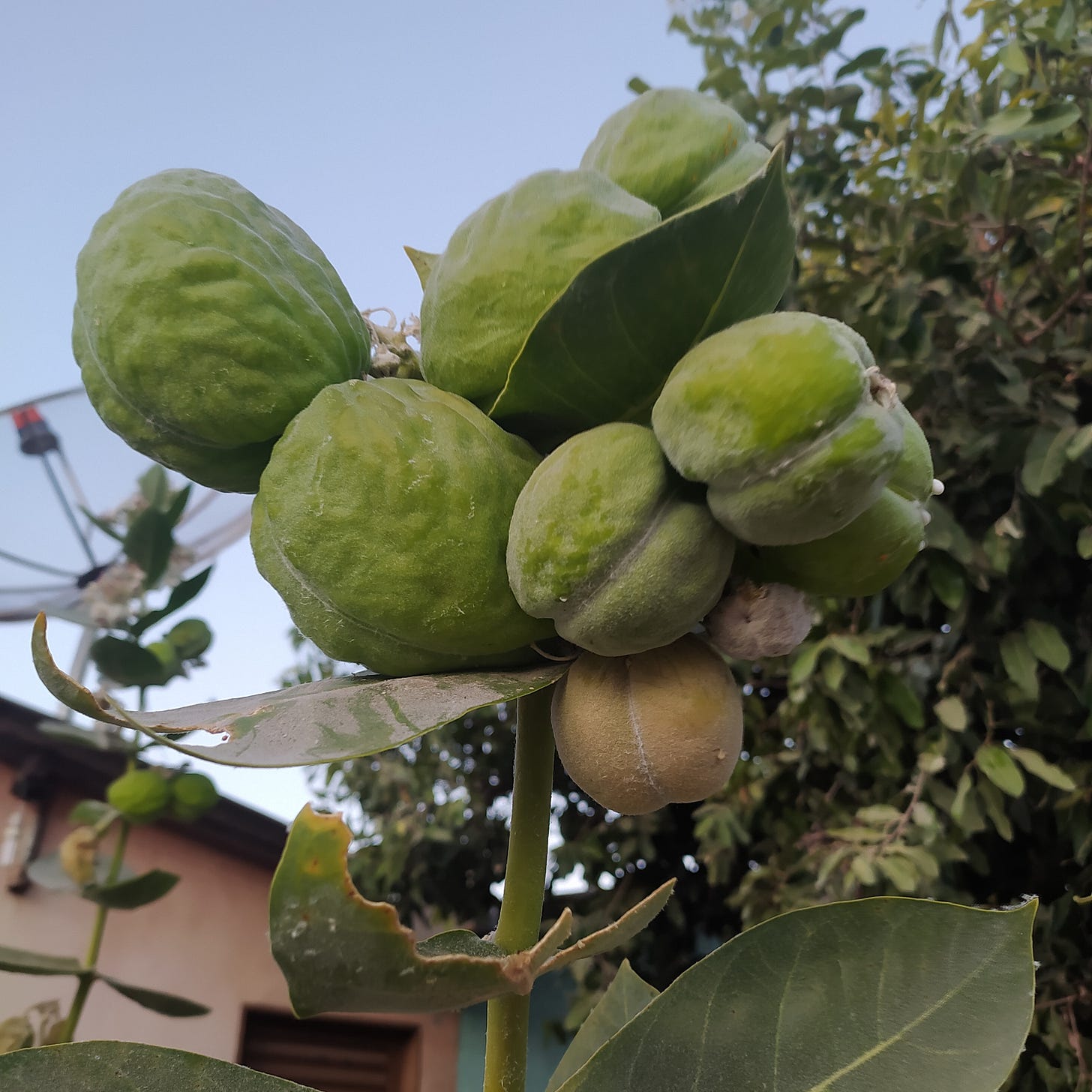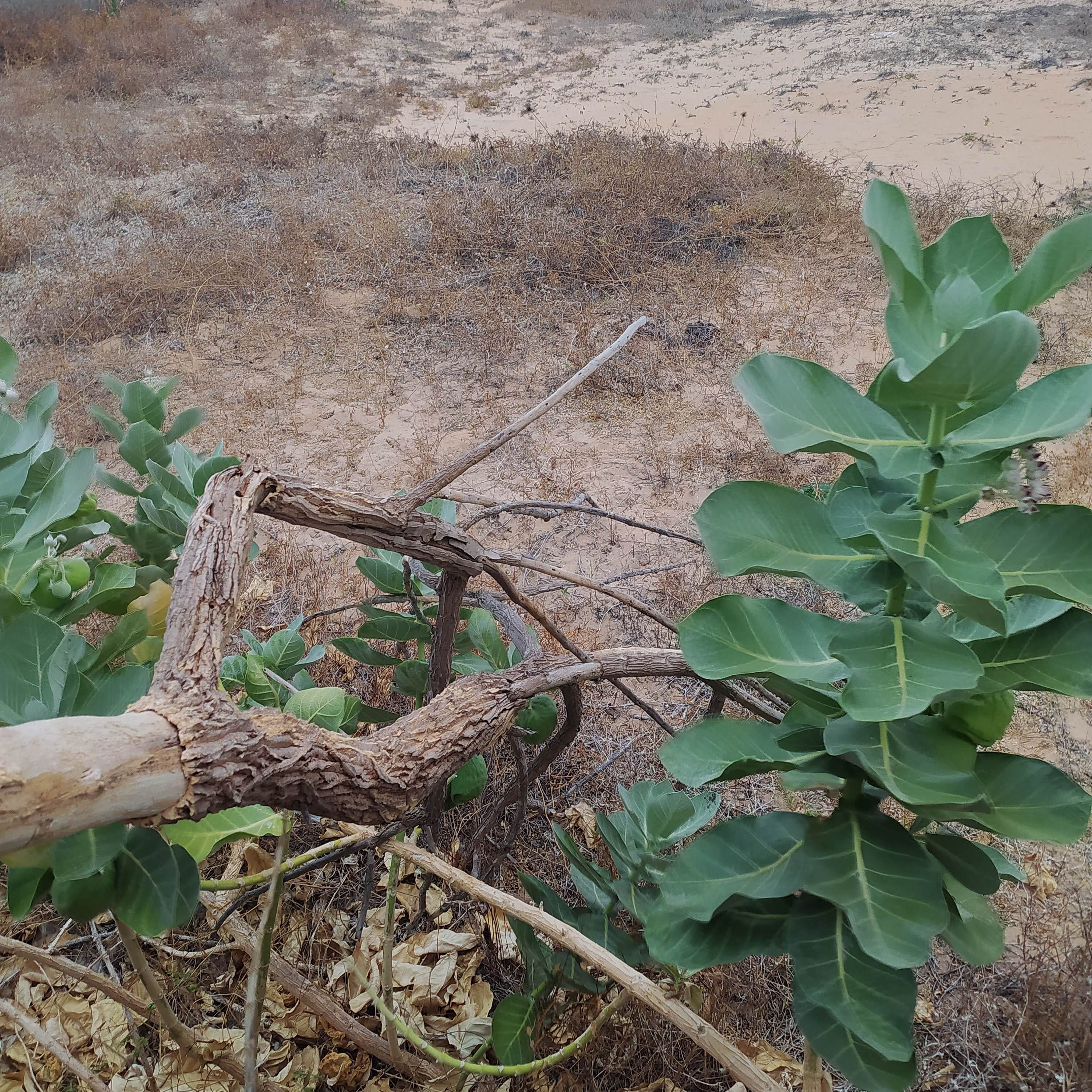 A Calotropis procera parece que veio da África, Índia e Pérsia e se adaptou muito bem ao semiárido brasileiro e a solos salinos. O que me surpreendeu foi a quantidade de usos medicinais dela, com pesquisas já consolidadas sobre o uso das folhas, tronco, raízes e do látex.
