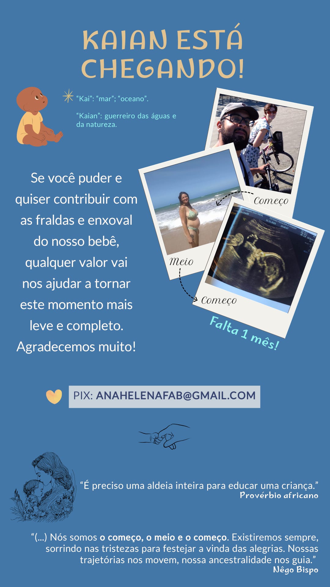 Estourei os caracteres e Kaian está quase estourando a minha barriga de ficar sentada. Não vou pedir apoios à escrita porque está rareada, mas prometo que volto antes para quem queira ler despretensões. Vou colocar aqui o banner de apoio às fraldinhas e enxoval, caso você não tenha visto, e já vou dando tchau! Obrigada por estar aqui.
